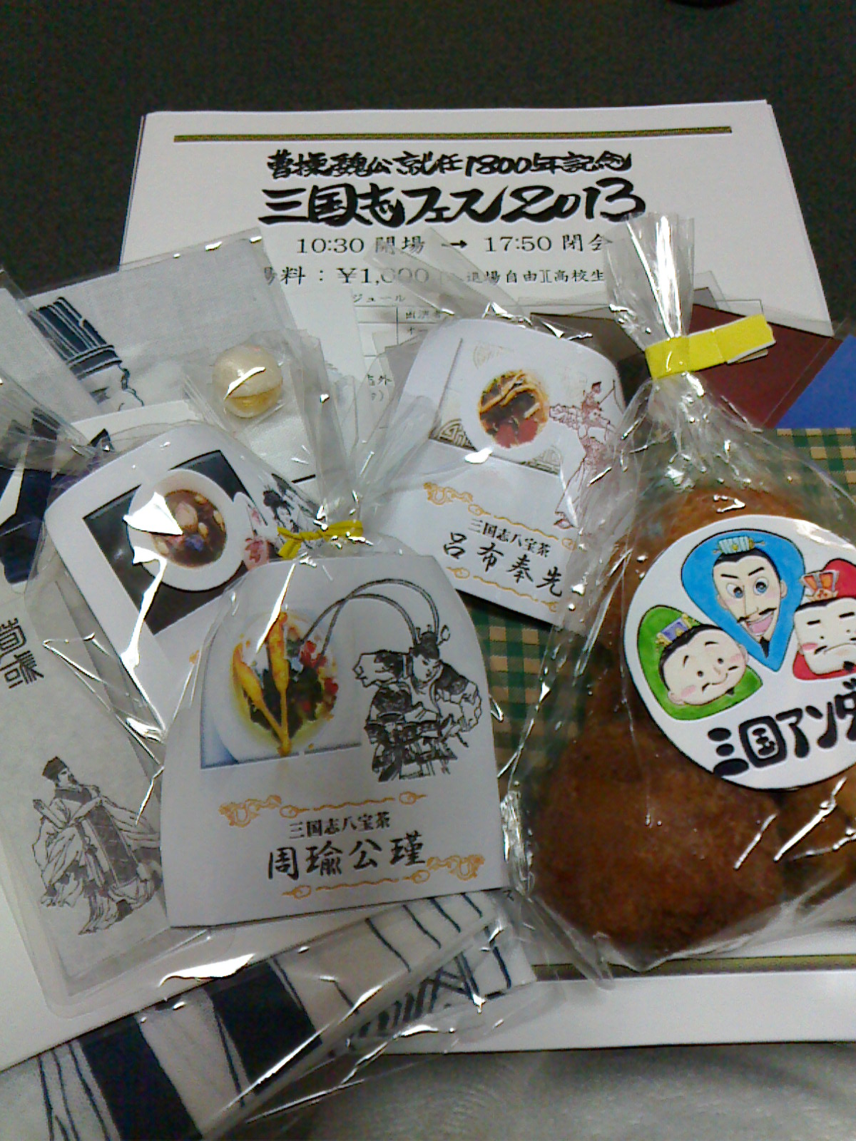 こんなもん? 手ぬぐいを買ったところでは、オマケでしおりと董卓印の相国飴(酒粕、金粉入りらしい)を、三国アンダ義のところは、張飛とジャンケンして買ってちんすこう。